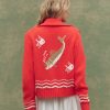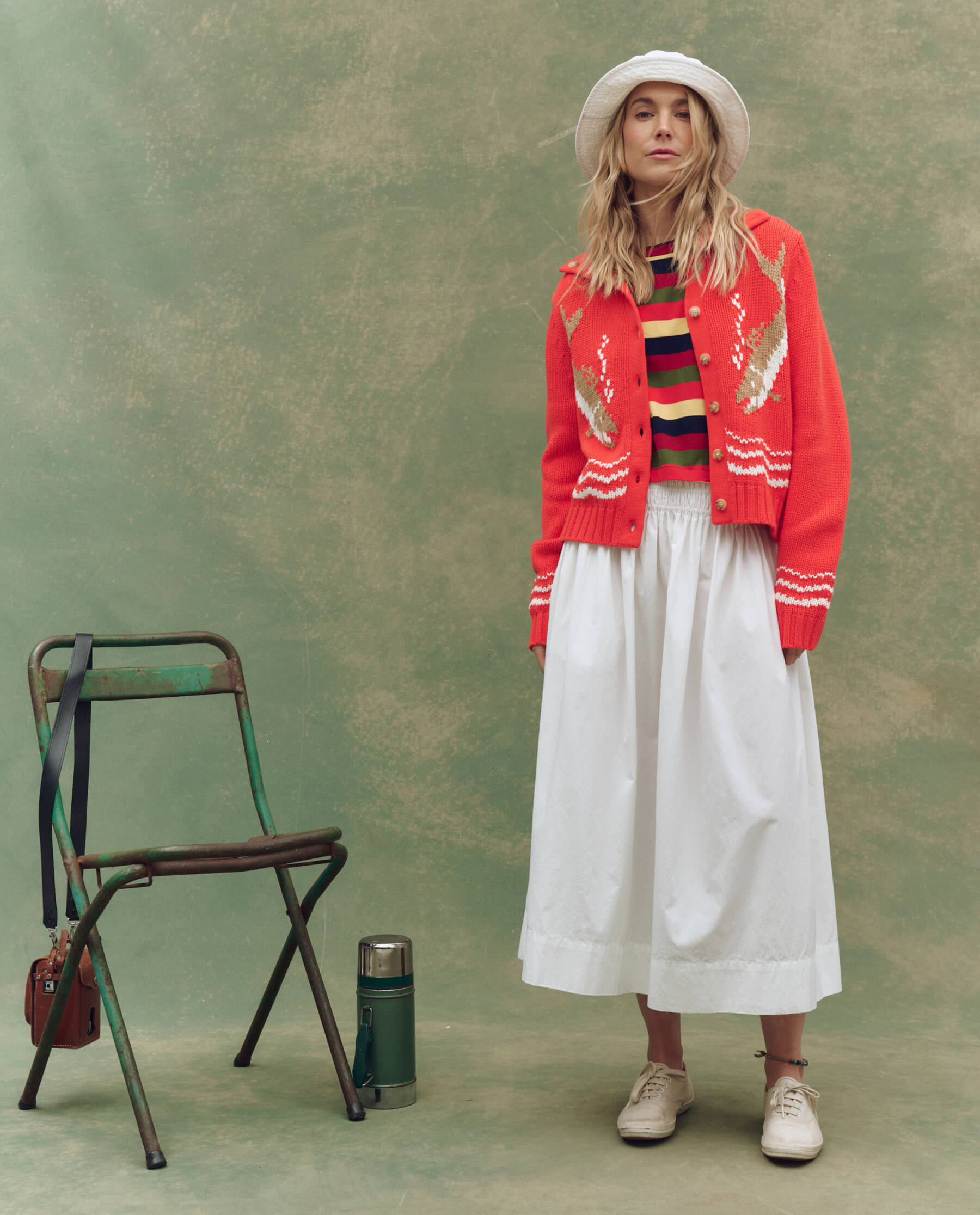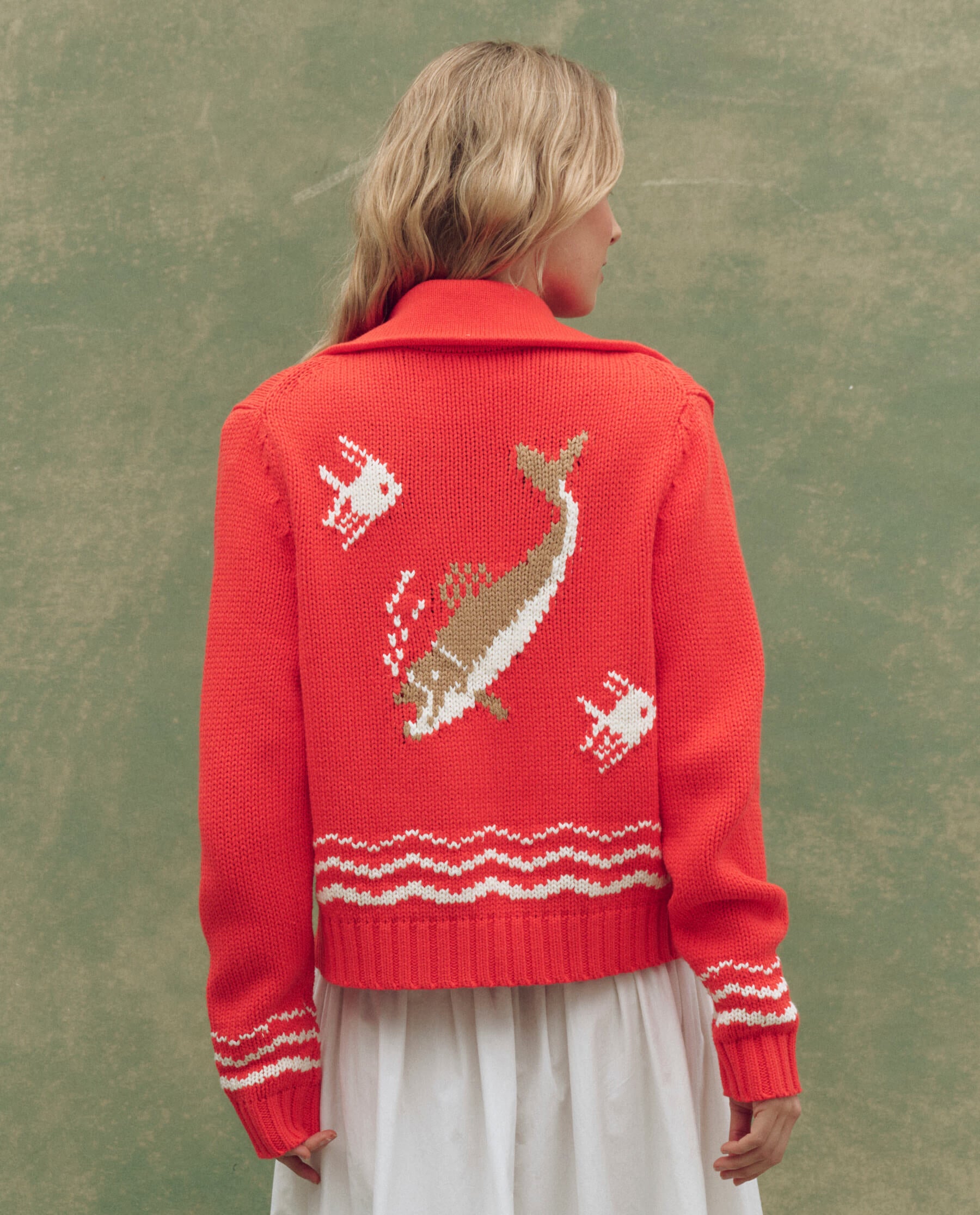 Based on a 1970s novelty fisherman sweater, The Bass Cardigan brings vintage character to a timeless knit. It features bass motifs on the front and back body, an oversized collar, set-in sleeves, and classic ribbing at the cuffs and hem. The fit is square through the body with straight sleeves and a slightly cropped length for easy layering. Spun from a soft, lightweight cotton blend yarn and finished with horn buttons for a nostalgic touch.