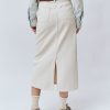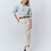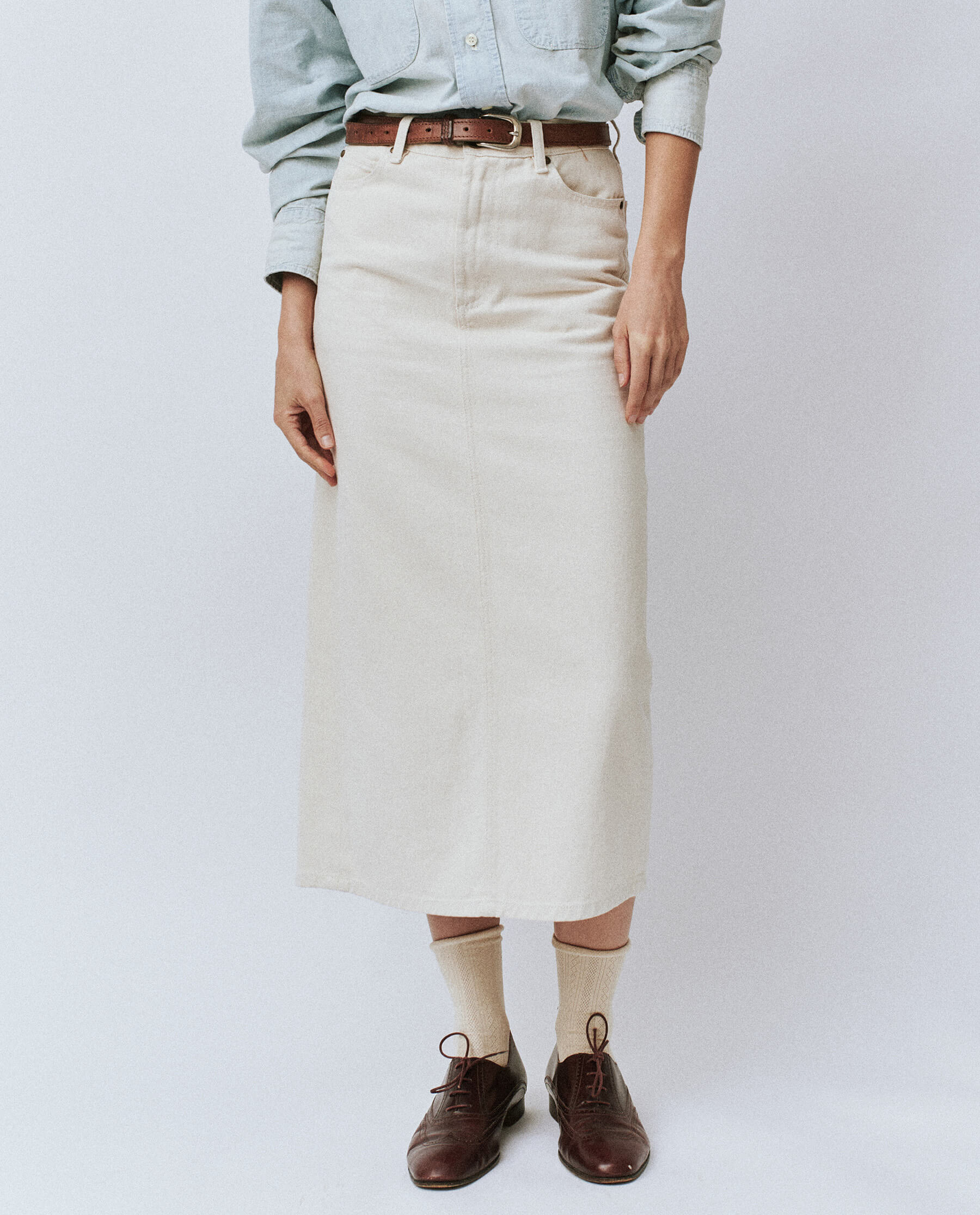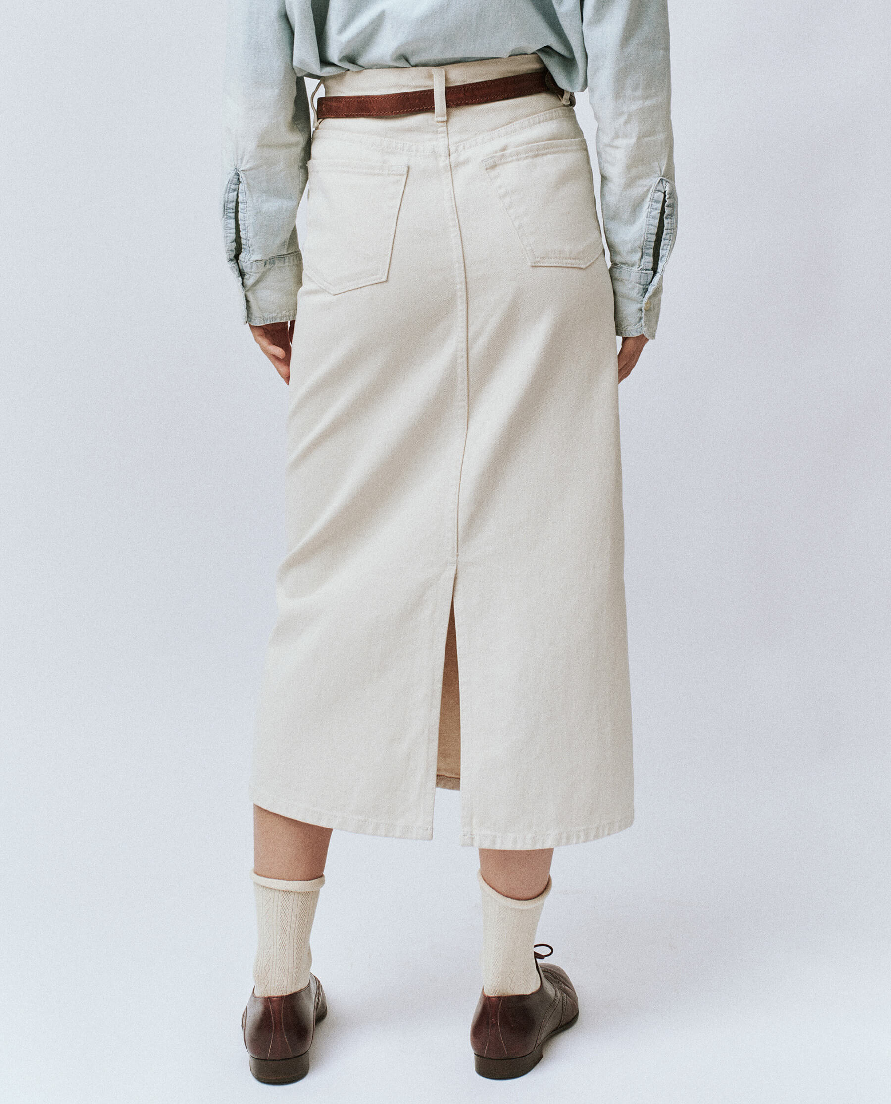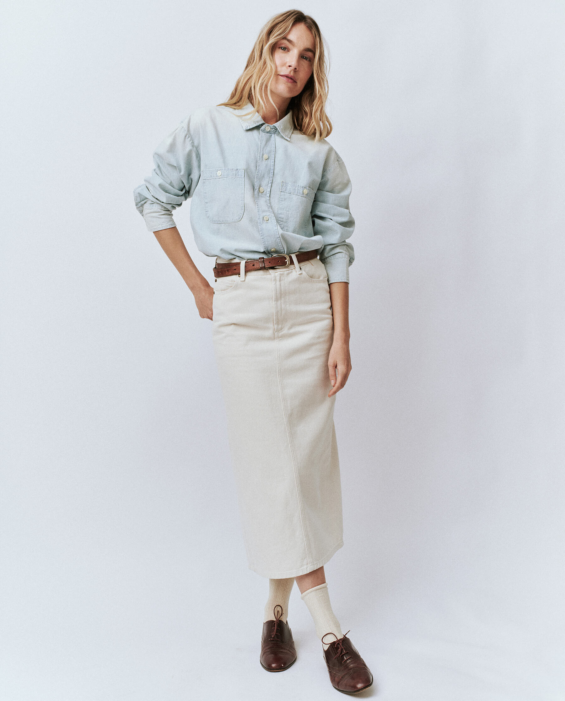 A versatile closet staple, The Column Skirt will be a forever favorite. This classic silhouette fits snug through the hips and straight through the body. It includes a back yoke with classic denim double stitching all around, and styles back to everything from tanks and tees to knits. The fit sits just below the waist and hits above the ankle with a slit up the center back body finished with a bar tack. Classic five-pocket details include a zip fly with metal button waist opening, finished with scoop pockets at the front and back patch pockets at the back.