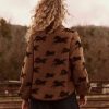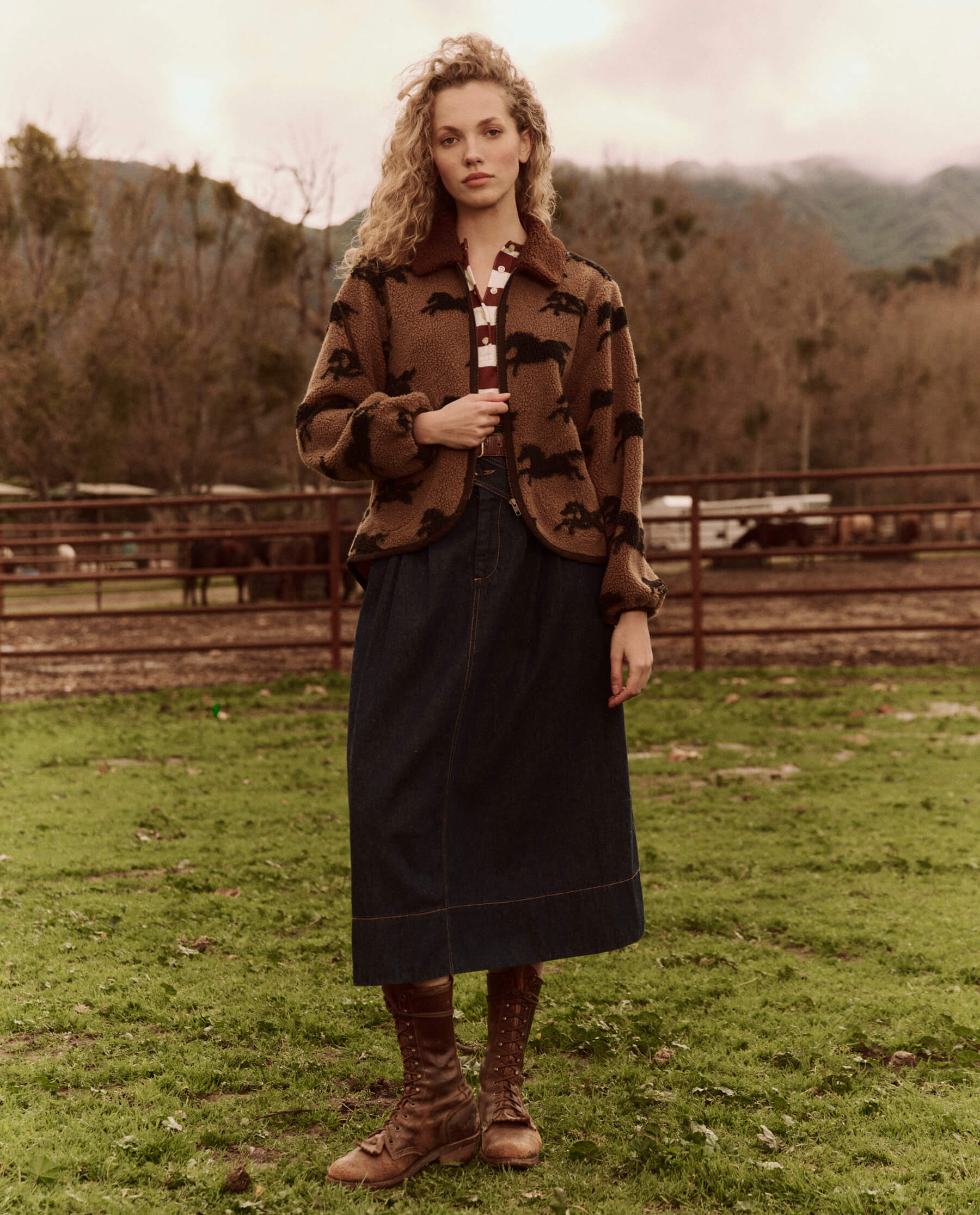 The Pasture Jacket. is ready for outdoor adventures. The cozy and relaxed zip-up jacket is crafted from the softest plush fabric and tells the story of wild horses running across a meadow. Distinguishing characteristics include a charming shirttail hemline, contrast stretch binding around the edges, a fluffy plush collar, billowy sleeves, and welt pockets in an earthy brown that pairs with literally everything in your closet.