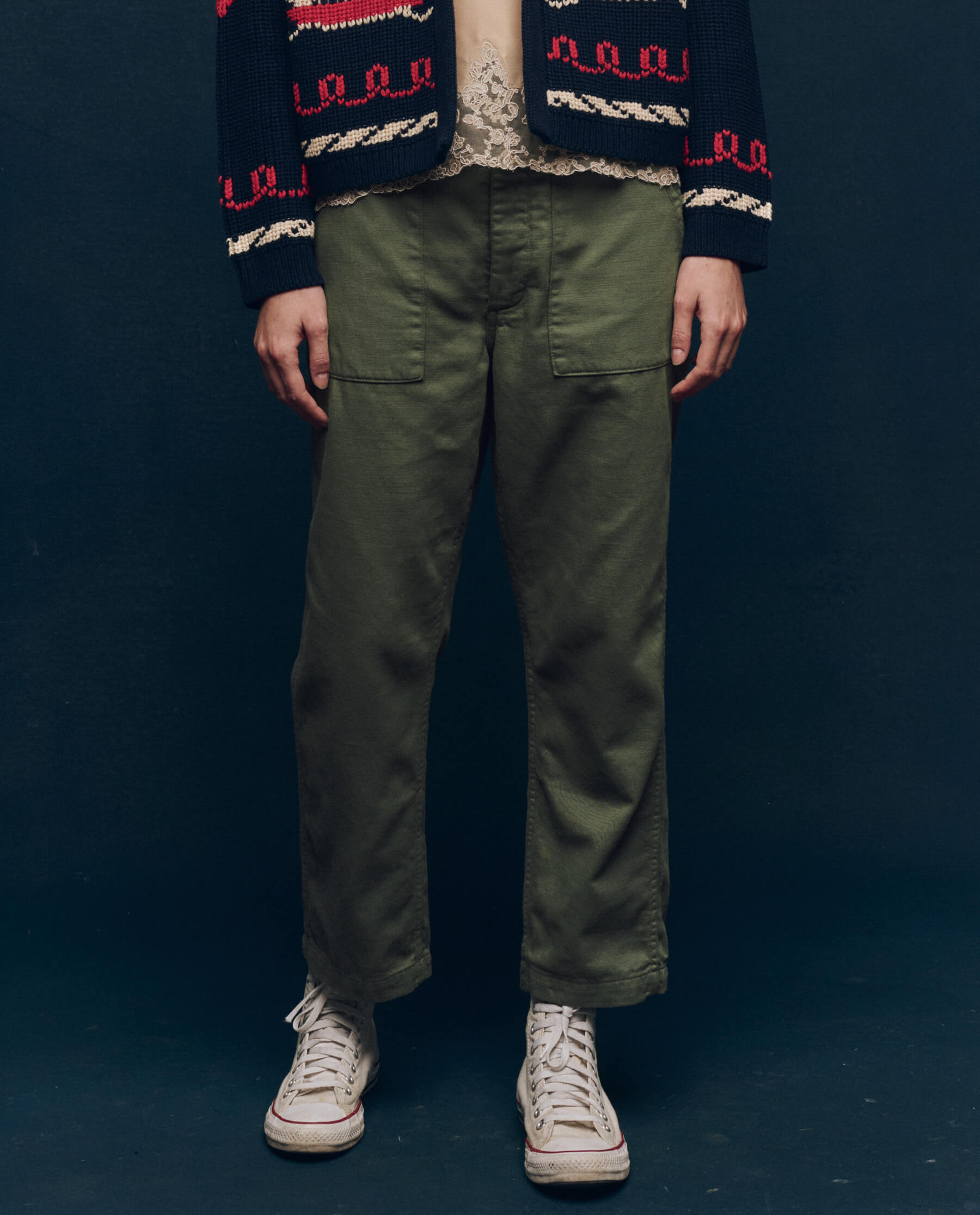 Inspired by classic military styles, this piece is made in LA from washed-down cotton sateen fabric. It has a slouchy fit that sits low on the hips with a wide, straight leg. Vintage details include a longer fly, patch pockets, corozo buttons, and double-needle stitching.
