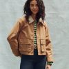 Inspired by heritage-style waxed cotton barn jackets, this reproduction has been reinterpreted with more interesting proportions. It features a cropped length that is longer at the back, creating a charming swing shape. The jacket is lined with cotton ticking stripe fabric, and a corduroy collar adds authentic detailing. It also includes a snap-front closure with a hidden front zipper, along with traditionally pleated, three-dimensional pockets and snaps at the flap closure.