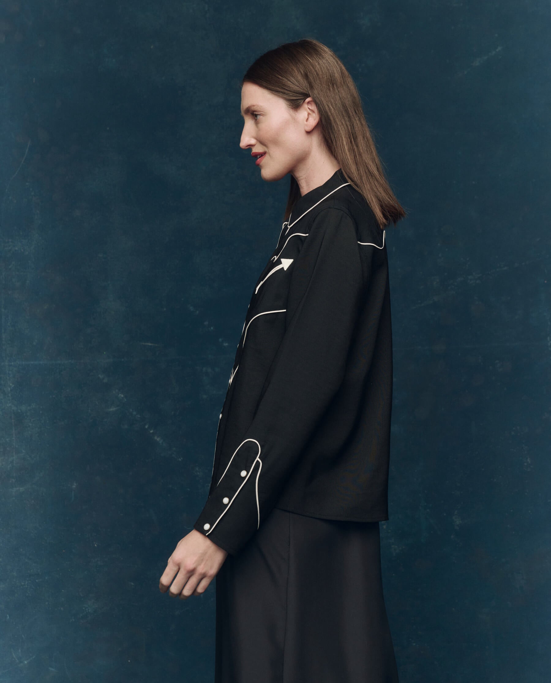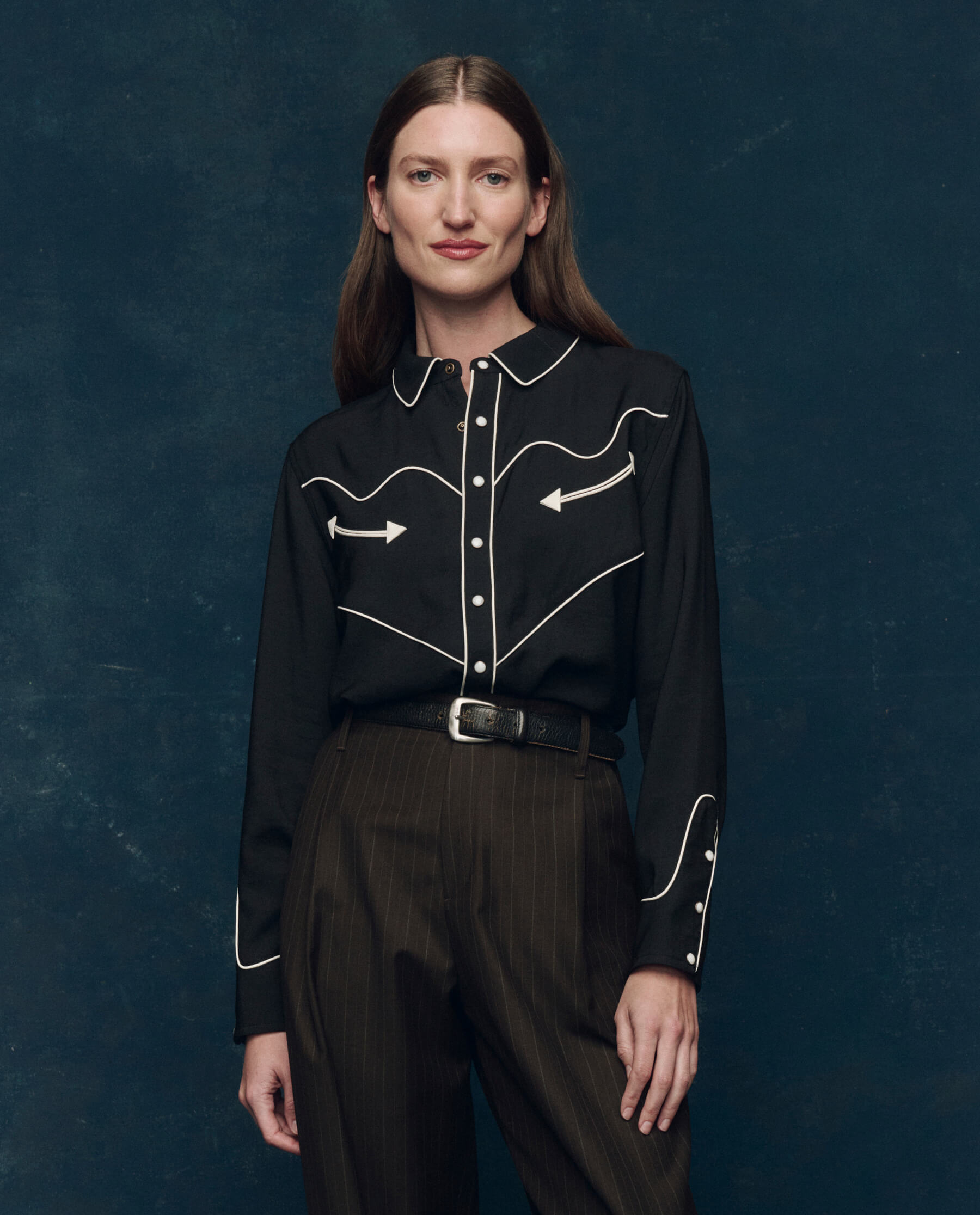 Rooted in classic rodeo style and reimagined with feminine charm, The Western Shirt is our ode to the iconic silhouettes of the American West. Cut from a sleek, drapey rayon twill, it moves with ease and carries just the right amount of shine. The details make it special—think curved western yoke, piped seaming, tall cuffs, and authentic pearl snaps that lend a vintage authenticity. The boxy fit and tapered cuffs create a flattering shape, while the tailored collar brings a polished touch. A timeless staple with storytelling stitched into every seam—pair it with denim for an effortlessly cool look that rides between rugged and refined.