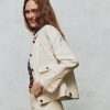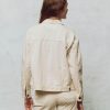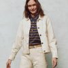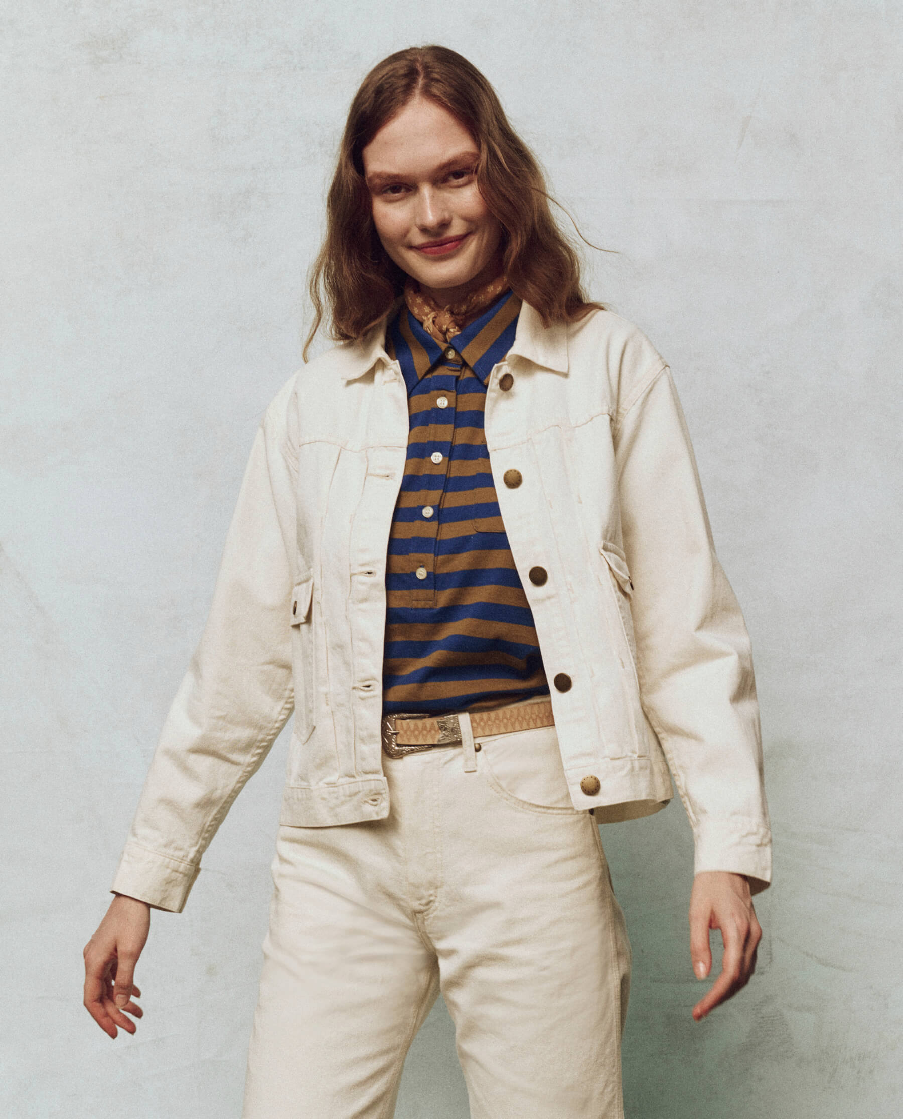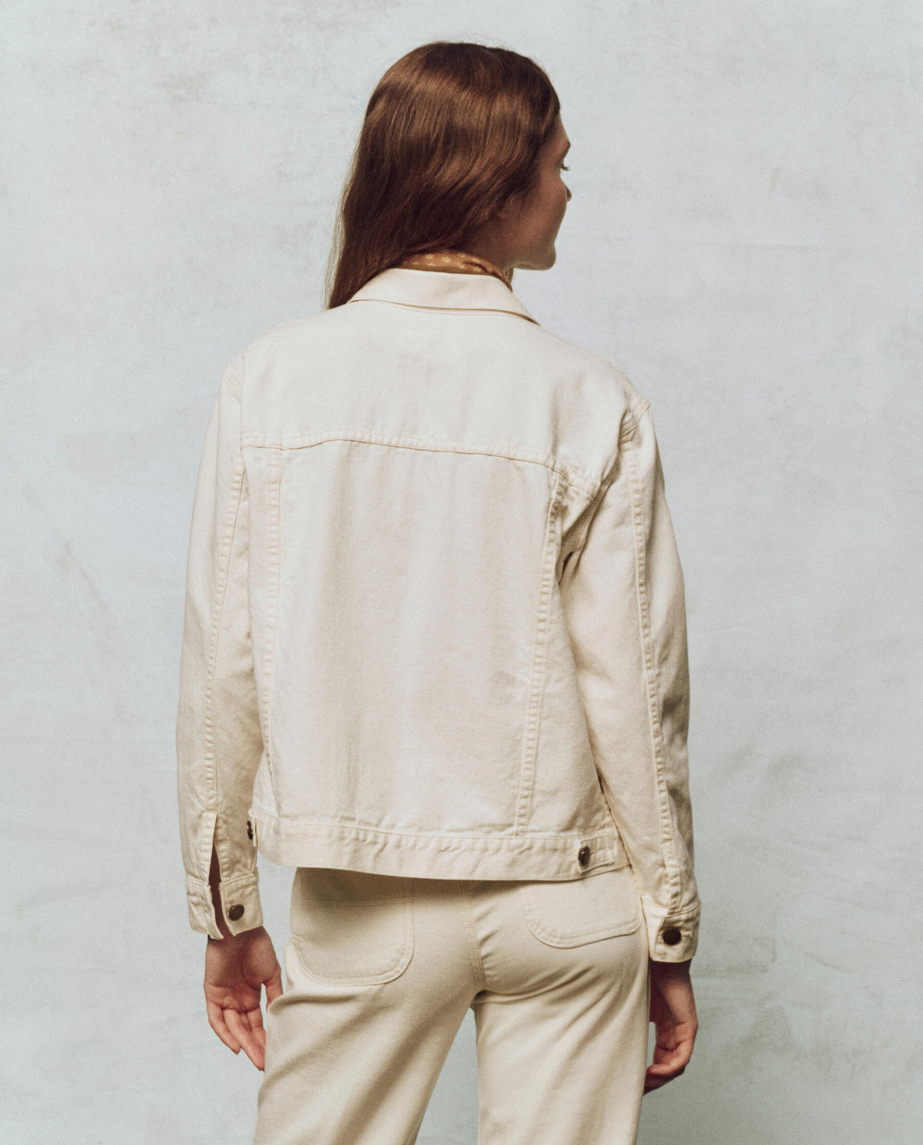 Inspired by men's outerwear from the 1930s to the 1950s, this jacket features authentic details like double pleats down the front, complemented by bar tack stitching. It has a relaxed, boxy fit for a comfortable yet stylish look. The jacket includes front patch pockets with metal tack button closures, as well as tack button closures at the front body and cuffs. Adjustable waist tabs at the back waistband allow for a customized fit. It is offered in a Natural shade of our Cotton Hemp denim and a dark Rinse wash.