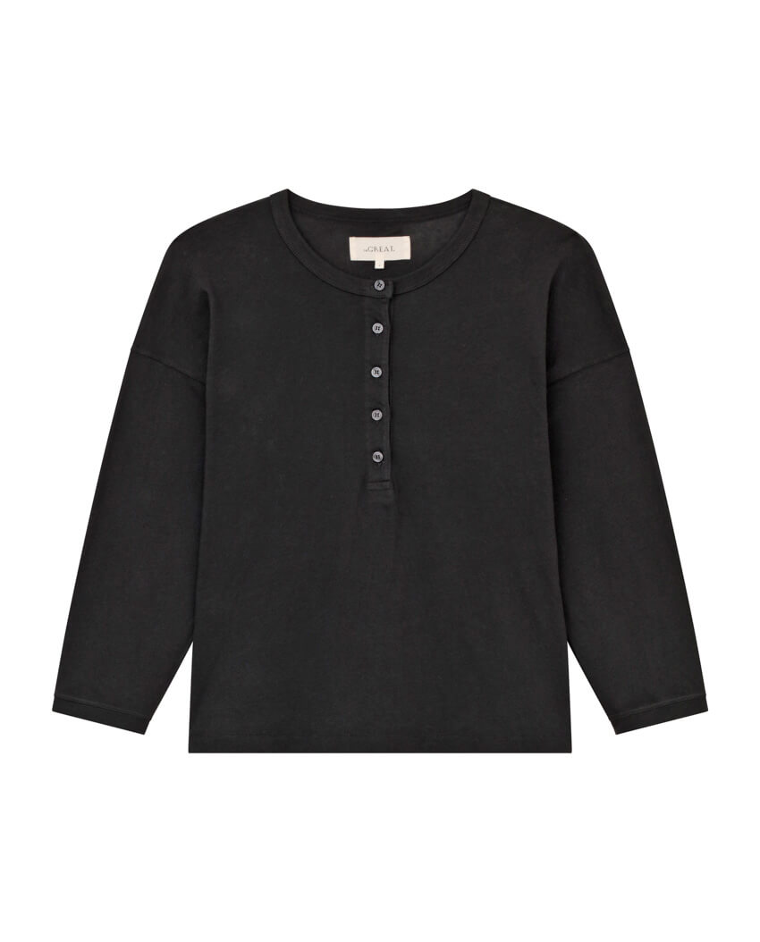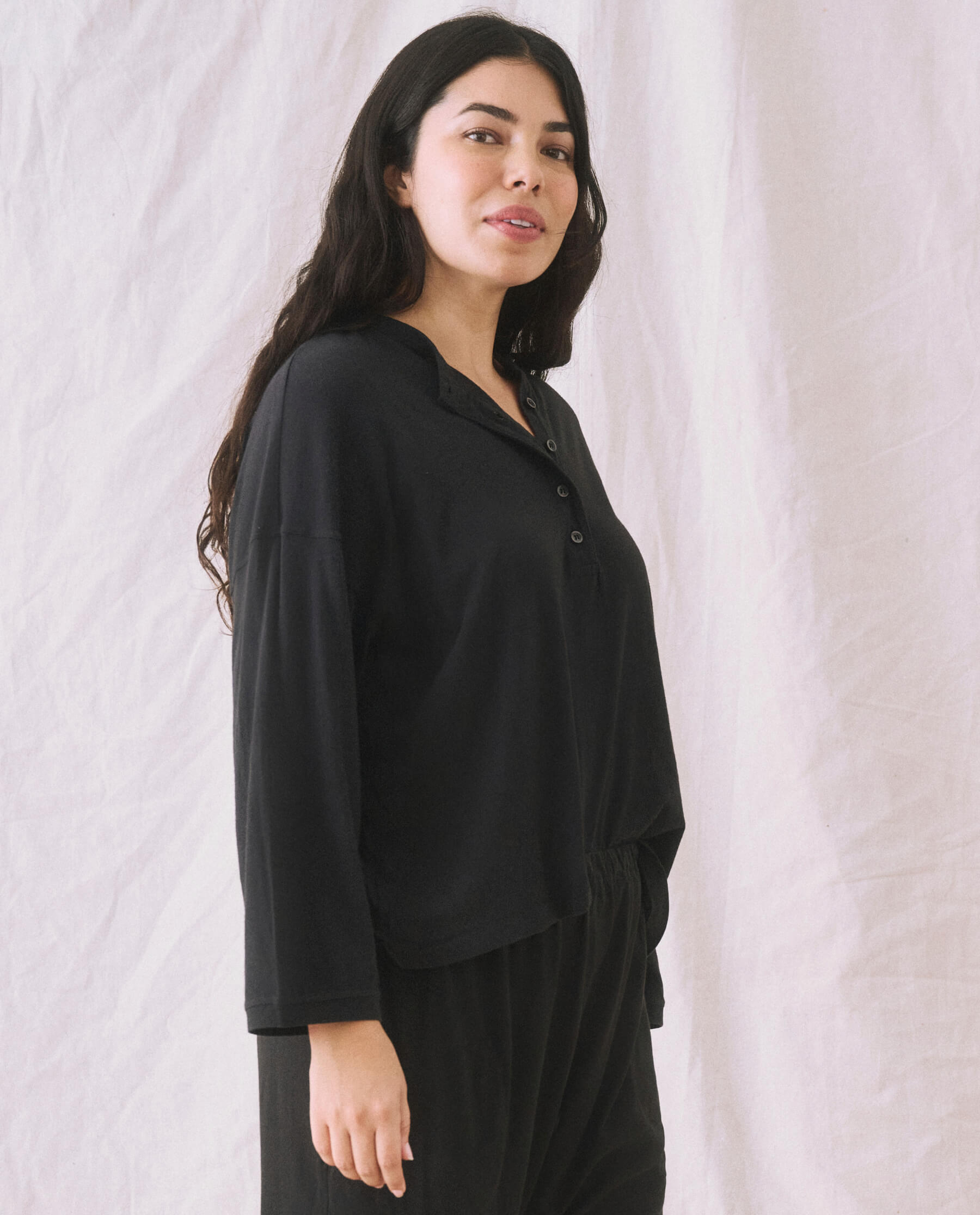 Inspired by a boxy boyish henley, we tinkered with the proportions of this beloved style for a more flattering fit. This classic shape features a crew neckline with a deep button placket, classic shirting buttons, a dropped shoulder, and a sleeve length that hits just above the wrist. Handcrafted locally in Los Angeles, our process ensures beauty and uniqueness—no two pieces are alike.