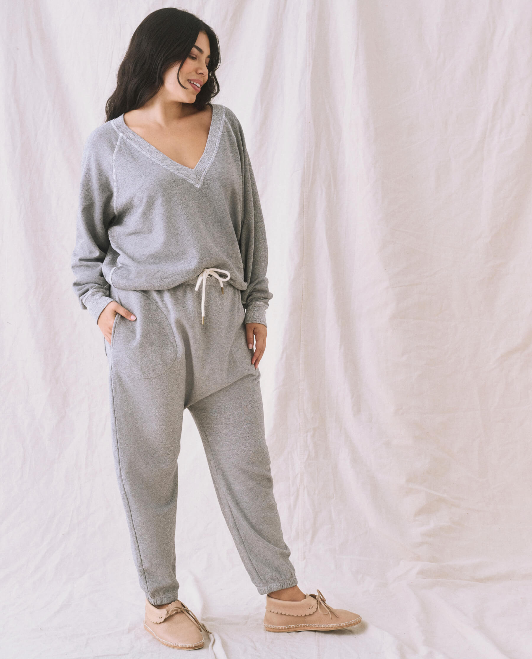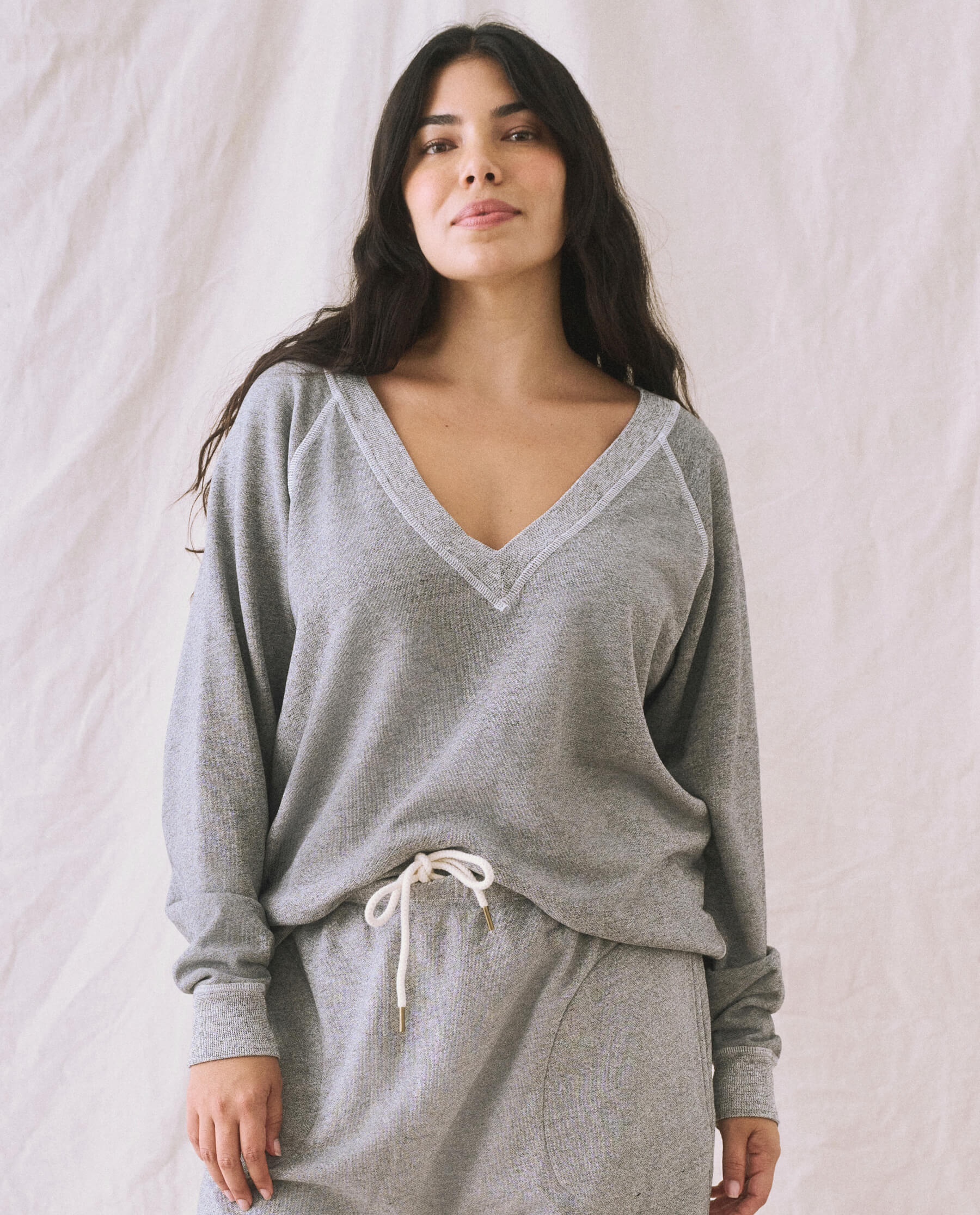 Based on our bestselling sweatshirt, The College Sweatshirt., The V-Neck Sweatshirt. features a deep V-neck opening framed with wide binding. Made from a double washed terry, this relaxed sweatshirt has a lived-in vintage wash and raglan sleeve. All our knits are crafted here in Los Angeles, ensuring authenticity, beauty and uniqueness in that no two pieces are alike.