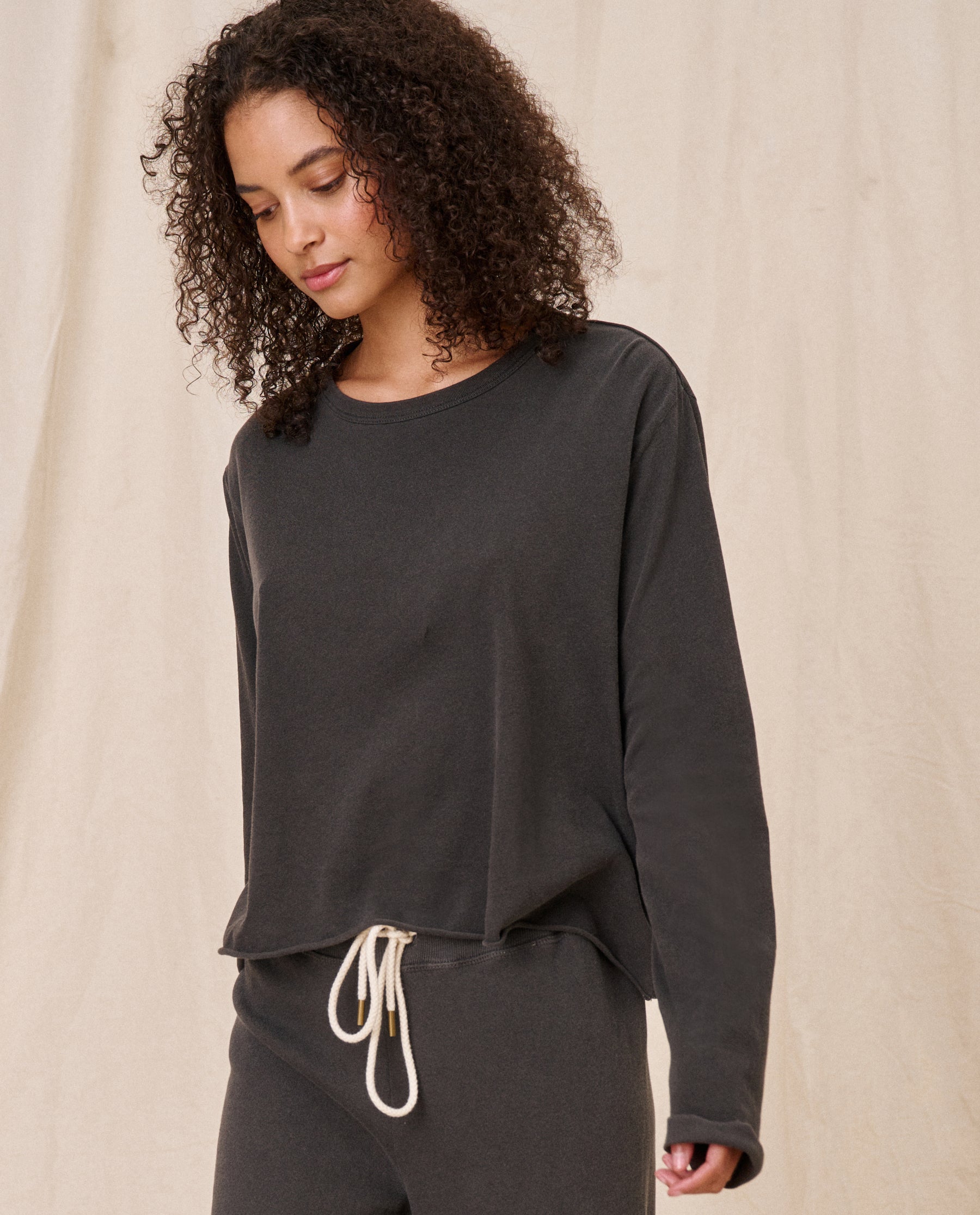 Our cherished square cropped tee updated with longer, slim arms that are perfect for layering under everything. This tee is boxier with shorter proportions and a signature raw hem and cuffs. Handcrafted locally in Los Angeles, our process ensures beauty and uniqueness—no two pieces are alike.